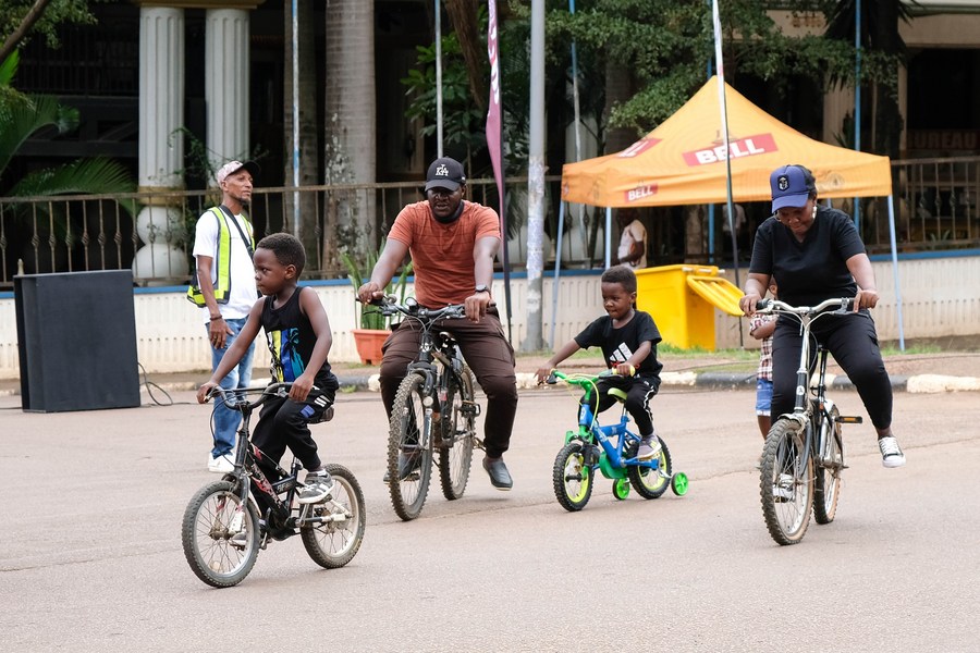 A family ride bicycles on Kampala Car Free Day in Kampala, the capital of Uganda, on March 26, 2023.(Photo by Hajarah Nalwadda/Xinhua)