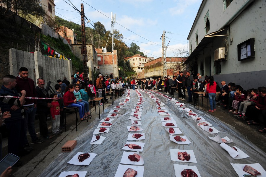 Members of a charity organization distribute meat to people in need in Sidi Naamane, Tizi Ouzou Province, Algeria, on March 17, 2023. Ahead of the Muslim holy month of Ramadan, charitable organizations hold food distribution events across Algeria. (Xinhua)