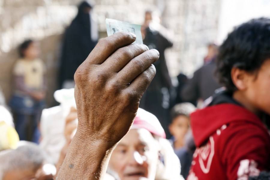 People wait to receive rationed food at a charity center in Sanaa, Yemen, on March 23, 2023. (Photo by Mohammed Mohammed/Xinhua)