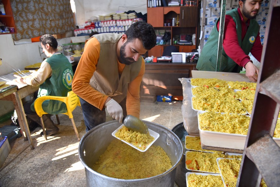 Volunteers prepare food for displaced people at a charity kitchen in Aleppo, Syria, Feb. 12, 2023. (Photo by Monsef Memari/Xinhua)