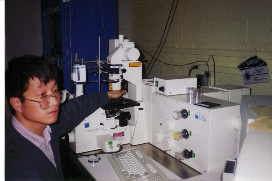 This undated file photo provided by the interviewee shows Cheng Heping, now a leading Chinese biomedical expert, operating a confocal microscope in a research lab in Maryland, the United States, back in 1995. (Xinhua)