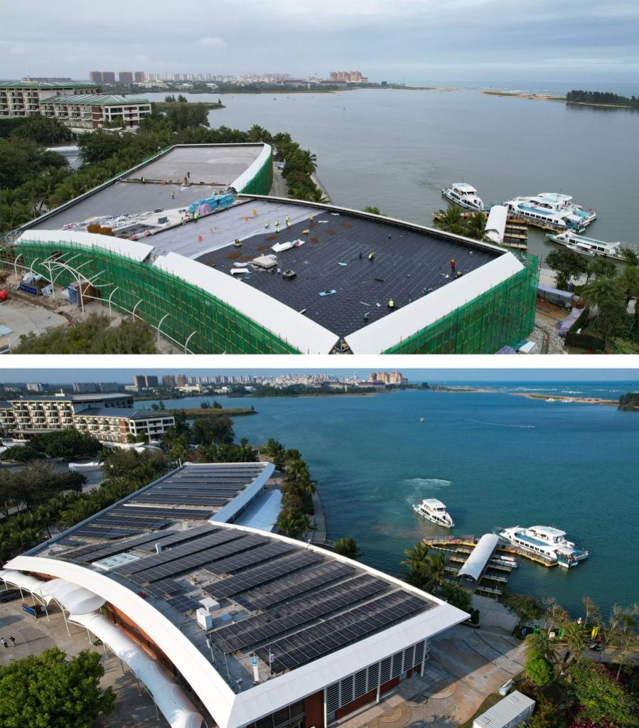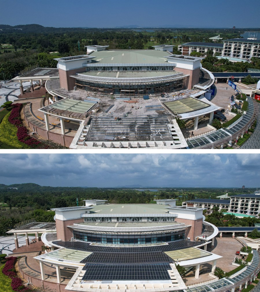 This combo aerial photo shows the Boao Forum for Asia (BFA) International Conference Center under renovation on Feb. 24, 2023 (above) and after its renovation on March 15, 2023 (below), in the zero-carbon demonstration zone in Boao, south China's Hainan Province. (Xinhua/Yang Guanyu)