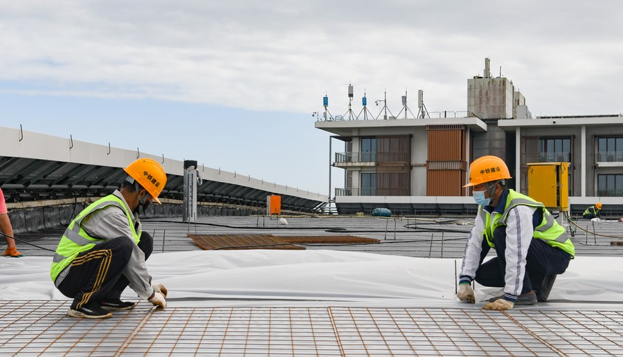 Workers perform tasks at a building renovation project in the zero-carbon demonstration zone in Boao, south China's Hainan Province, Jan. 12, 2023. (Xinhua/Yang Guanyu)