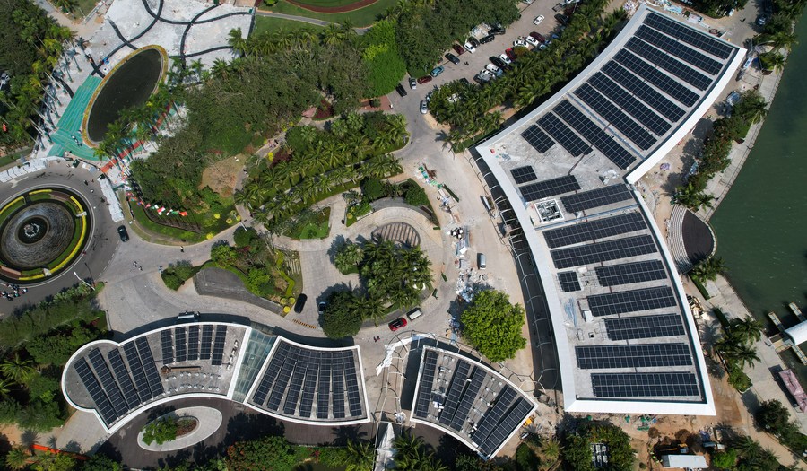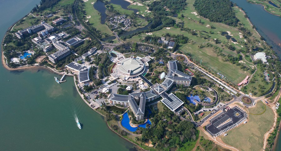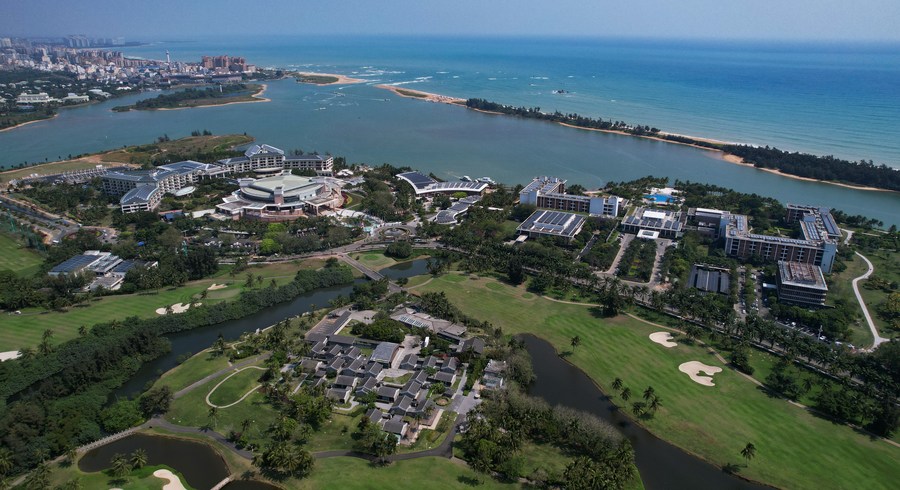 This aerial photo taken on Feb. 24, 2023 shows a view of the renovated press center of the Boao Forum for Asia (BFA) in the zero-carbon demonstration zone in Boao, south China's Hainan Province. (Xinhua/Yang Guanyu)