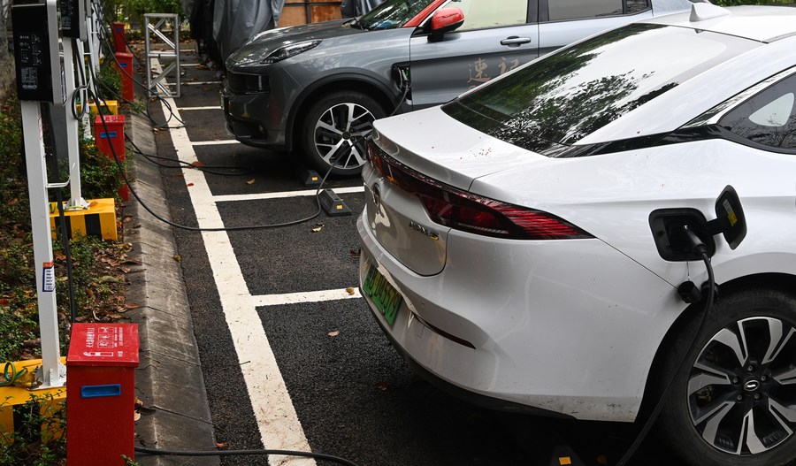 New energy vehicles are charged in the zero-carbon demonstration zone in Boao, south China's Hainan Province, March 28, 2023. (Xinhua/Yang Guanyu)