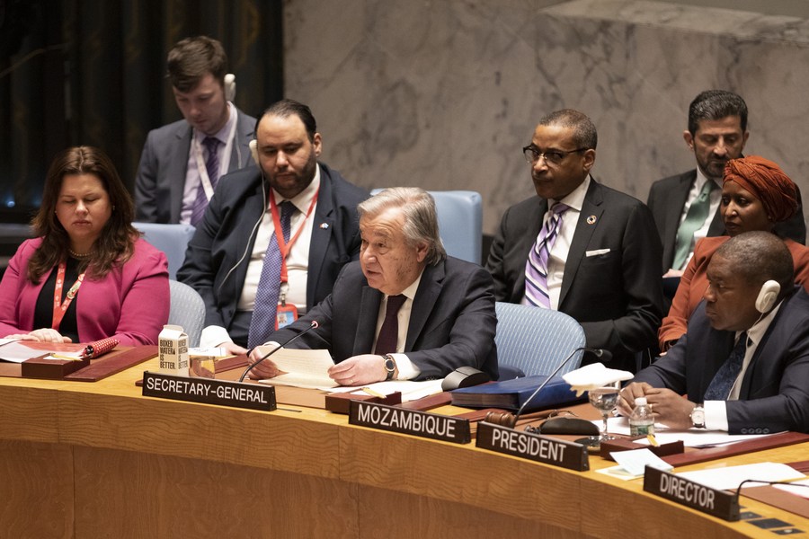 United Nations Secretary-General Antonio Guterres (C, Front) speaks at a Security Council high-level debate on countering terrorism by strengthening cooperation between the United Nations and regional organizations at the UN headquarters in New York, on March 28, 2023. (Xinhua/Xie E)
