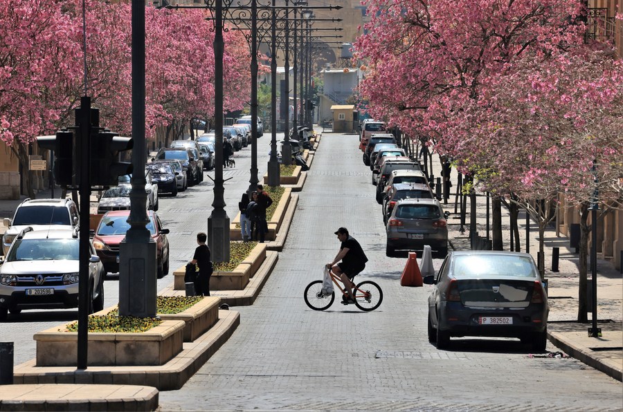 Cars are seen parking along the roadside of a street with blossoming trees in downtown Beirut, Lebanon, on March 26, 2023. (Xinhua/Liu Zongya)