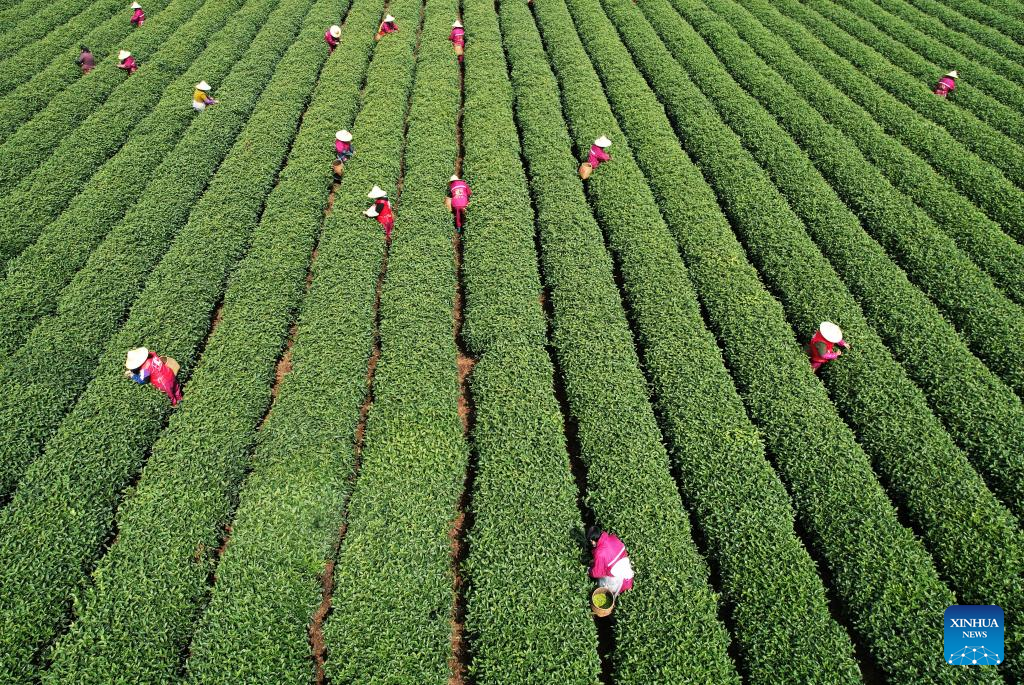 This aerial photo shows workers harvesting tea leaves at a tea garden in Xihu District, Hangzhou, east China's Zhejiang Province, March 28, 2023. Recently, workers are busy in harvesting and processing tea leaves ahead of the Qingming Festival to produce the Mingqian (literally "pre-Qingming") tea, which are made of the very first tea sprouts in spring and considered to be of high quality. (Xinhua/Long Wei)