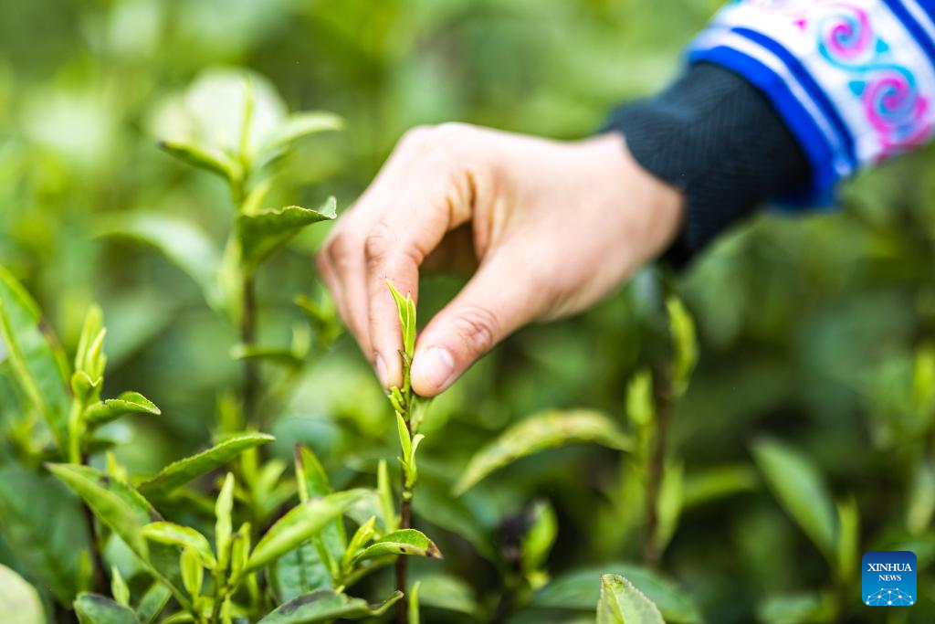 Workers harvest tea leaves at a tea garden in Huawo Village, Bijie, southwest China's Guizhou Province, March 28, 2023. Recently, workers are busy in harvesting and processing tea leaves ahead of the Qingming Festival to produce the Mingqian (literally "pre-Qingming") tea, which are made of the very first tea sprouts in spring and considered to be of high quality. (Xinhua/Huang Xiaohai)