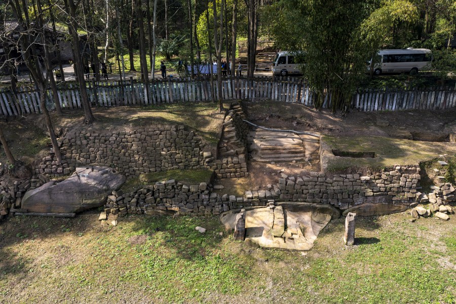 This aerial photo taken on March 20, 2023 shows newly unearthed remains of city gate and walls in Diaoyu City scenic area in Hechuan District of southwest China's Chongqing Municipality. (Xinhua/Liu Chan)
