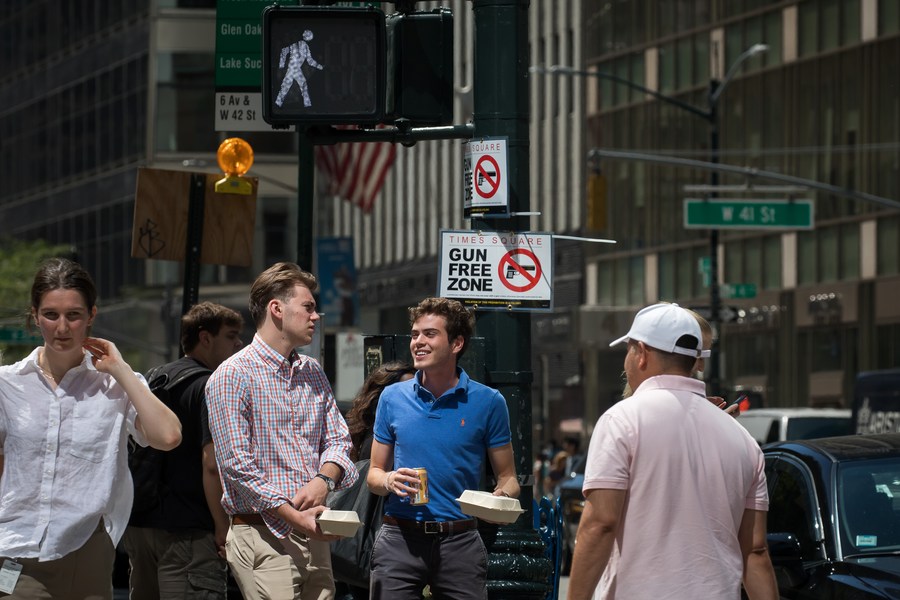 Passersby walk past the gun-free zone signage near Times Square in New York, the United States, Sept. 1, 2022. (Photo by Michael Nagle/Xinhua)