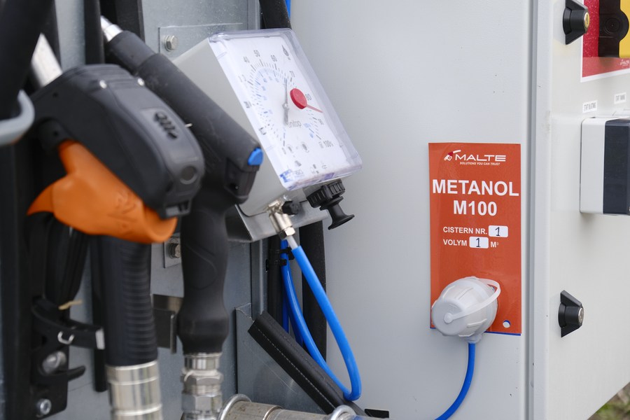A methanol pump is seen in Aalborg, Denmark on March 28, 2022. Chinese company Geely began test run of green e-methanol vehicles in the Danish port of Aalborg on Monday. (Xinhua/Lin Jing)