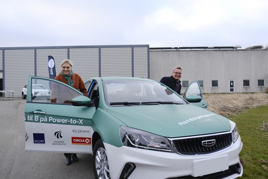 Danish Minister for Transport Trine Bramsen (L) takes part in the test run of a green e-methanol vehicle in Aalborg, Denmark on March 28, 2022. (Xinhua/Lin Jing)
