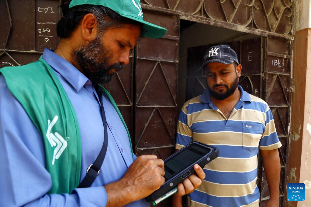 An official (L) from the Pakistan Bureau of Statistics uses a digital device to register information of a resident during the first-ever digital population and housing census in Karachi, Pakistan, March 15, 2023.(Str/Xinhua)