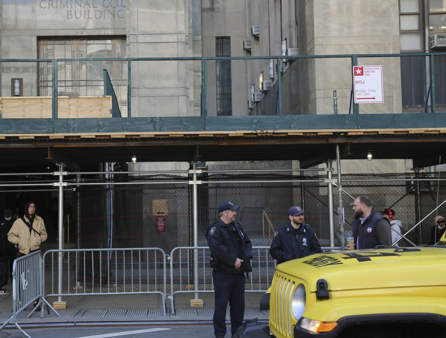 Policemen stand guard at an entrance of the Manhattan Criminal Court in New York, the United States, on March 21, 2023. (Xinhua/Liu Yanan)