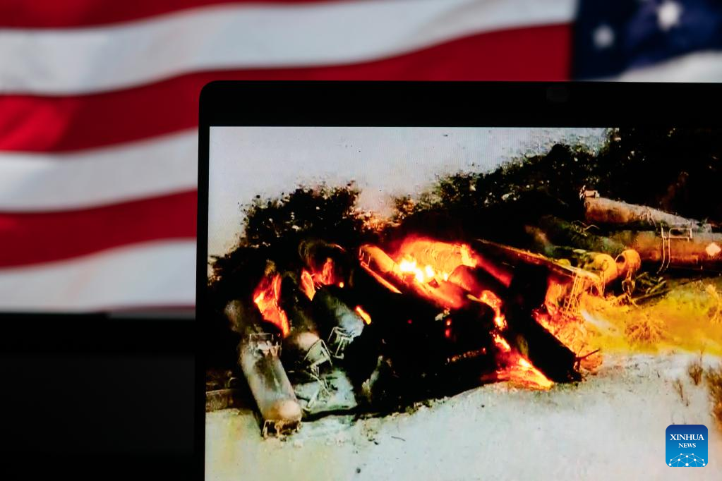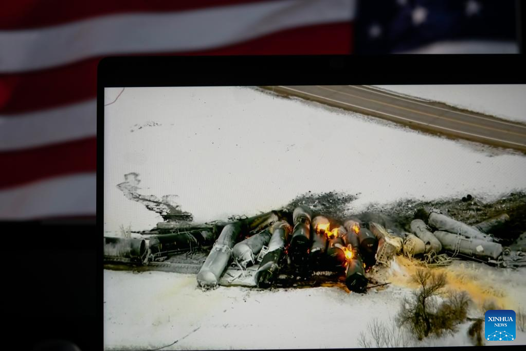A screen image captured on March 30, 2023 in Arlington, the United States shows the site of a derailed freight train near Raymond, the U.S. state of Minnesota. A freight train came off the tracks near Raymond, the U.S. state of Minnesota, early Thursday morning. (Xinhua/Liu Jie)