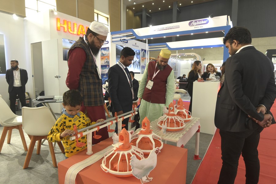 Visitors watch farm equipment at a Chinese booth during an exhibition in Dhaka, Bangladesh, Feb. 2, 2023. The "11th International Agro Tech Bangladesh-2023", South Asia's largest milling technology exhibition, was held between Feb. 2 and Feb. 4 in Bangladesh's capital city Dhaka. (Xinhua)