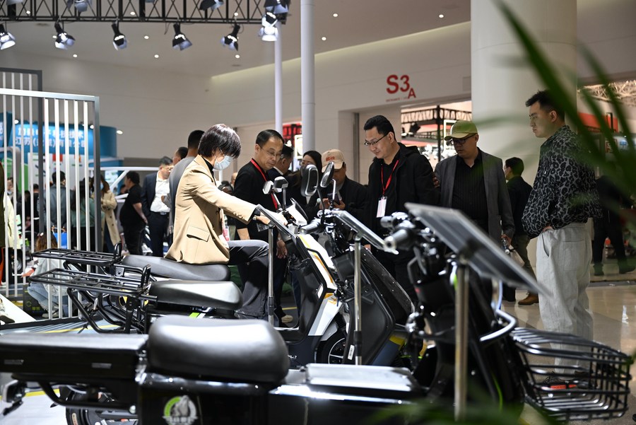 A visitor experiences an e-bike at the 21st China North International Bicycle & E-bike Exhibition in Tianjin, north China, March 30, 2023. (Xinhua/Zhao Zisuo)