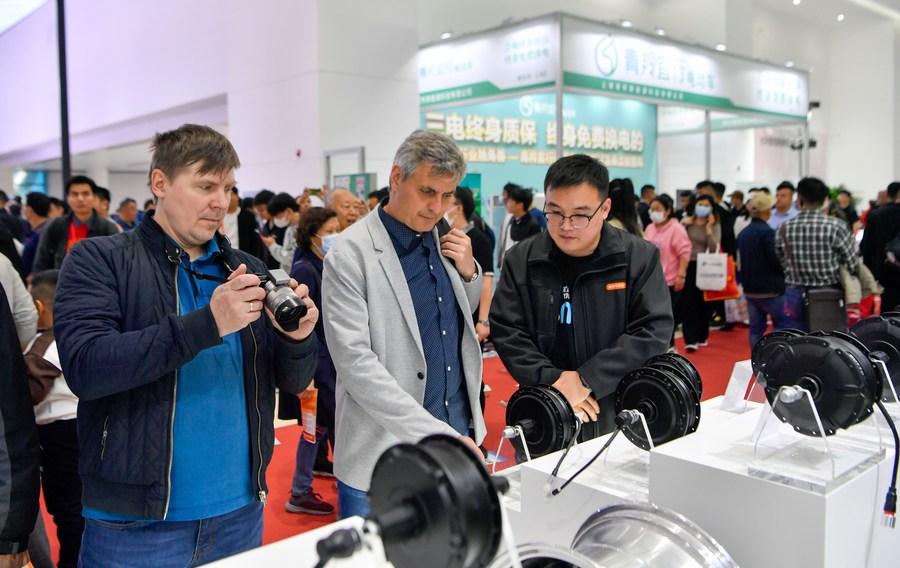 Visitors from Russia talk with an exhibitor at the 21st China North International Bicycle & E-bike Exhibition in Tianjin, north China, March 30, 2023. (Xinhua/Sun Fanyue)