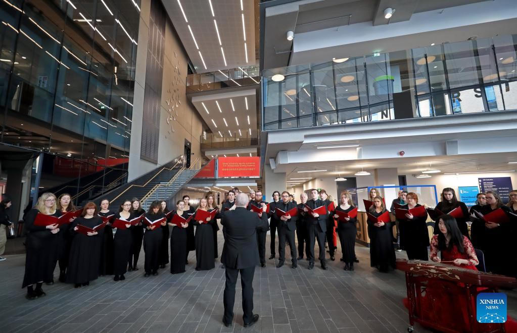Members of Ulster University Choir perform the Chinese song "I Love You, China," to welcome the visiting Chinese Ambassador to the United Kingdom (UK) Zheng Zeguang and his delegation, in Belfast, Northern Ireland, the United Kingdom, March 27, 2023. (Xinhua/Li Ying)