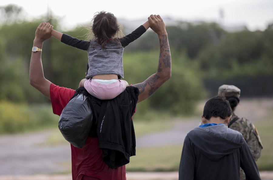 Migrants celebrate after they have arrived in Eagle Pass, Texas, the United States, July 25, 2022. (Photo by Nick Wagner/ Xinhua)
