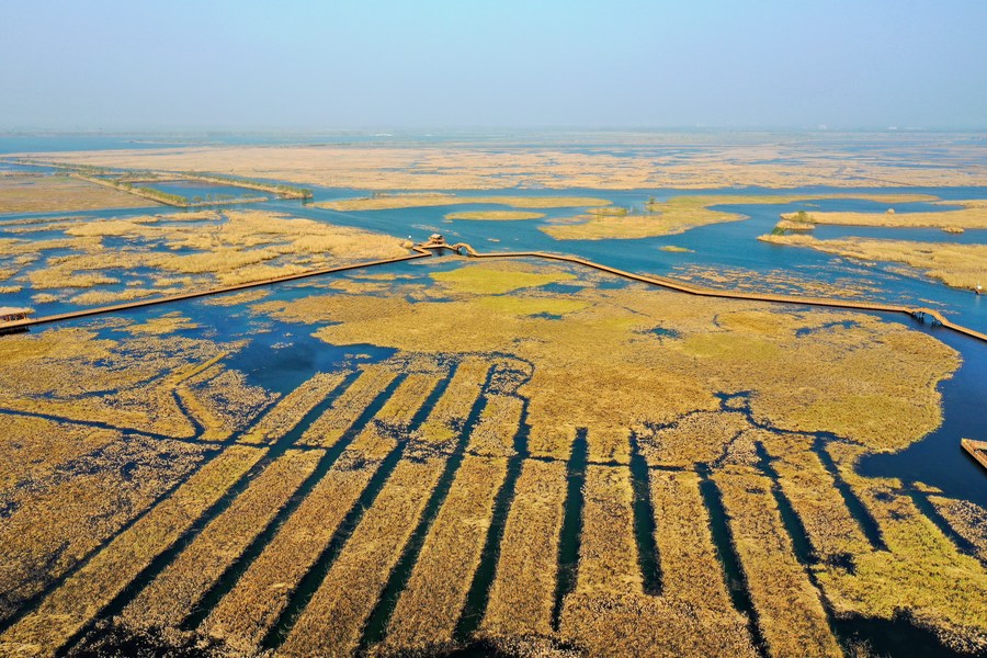 This aerial photo taken on March 30, 2023 shows the Baiyangdian scenic spot in Xiong'an New Area, north China's Hebei Province. (Xinhua/Mu Yu)■