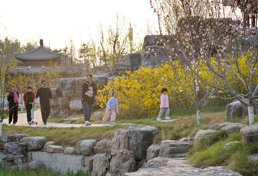 People visit a park in Xiong'an New Area, north China's Hebei Province, March 30, 2023. (Xinhua/Mu Yu)