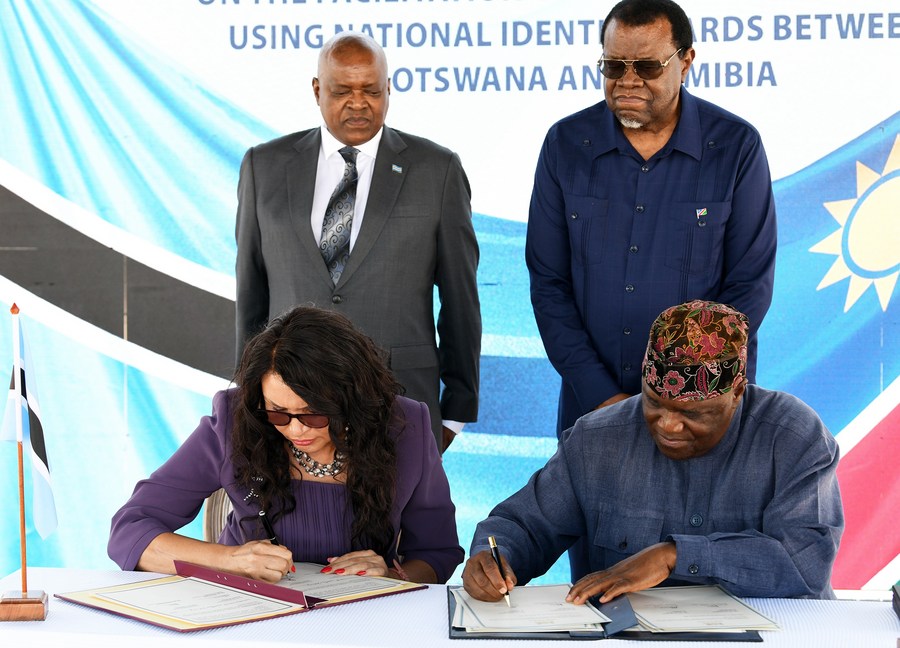 The file photo shows Botswanan President Mokgweetsi Masisi (L, Rear) and Namibian President Hage Geingob (R, Rear) attending a launch of the usage of national identity cards as documents for cross-border travel at Mamuno Border Post, Botswana, on Feb. 24, 2023. (Photo by Phenyo Moalosi/Xinhua)