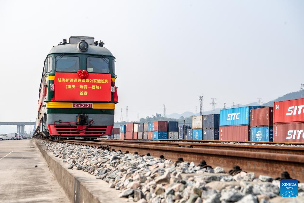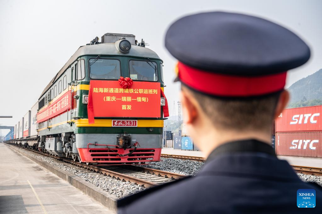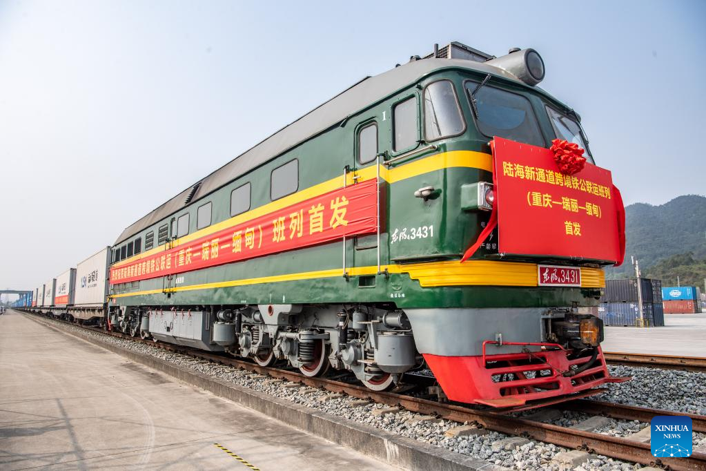 This photo taken on April 3, 2023 shows a freight train departing from the Jiangjin District of southwest China's Chongqing Municipality, marking the opening of a new transport route via the New International Land-Sea Trade Corridor. A total of 32 containers bearing goods such as ammonium sulfate, motorcycle parts and motorcycle tires will be transported to the Baoshan North Station in Yunnan Province. These goods will then be transported via highways, leaving China via a land port in the city of Ruili, before arriving at Myanmar. (Xinhua/Tang Yi)