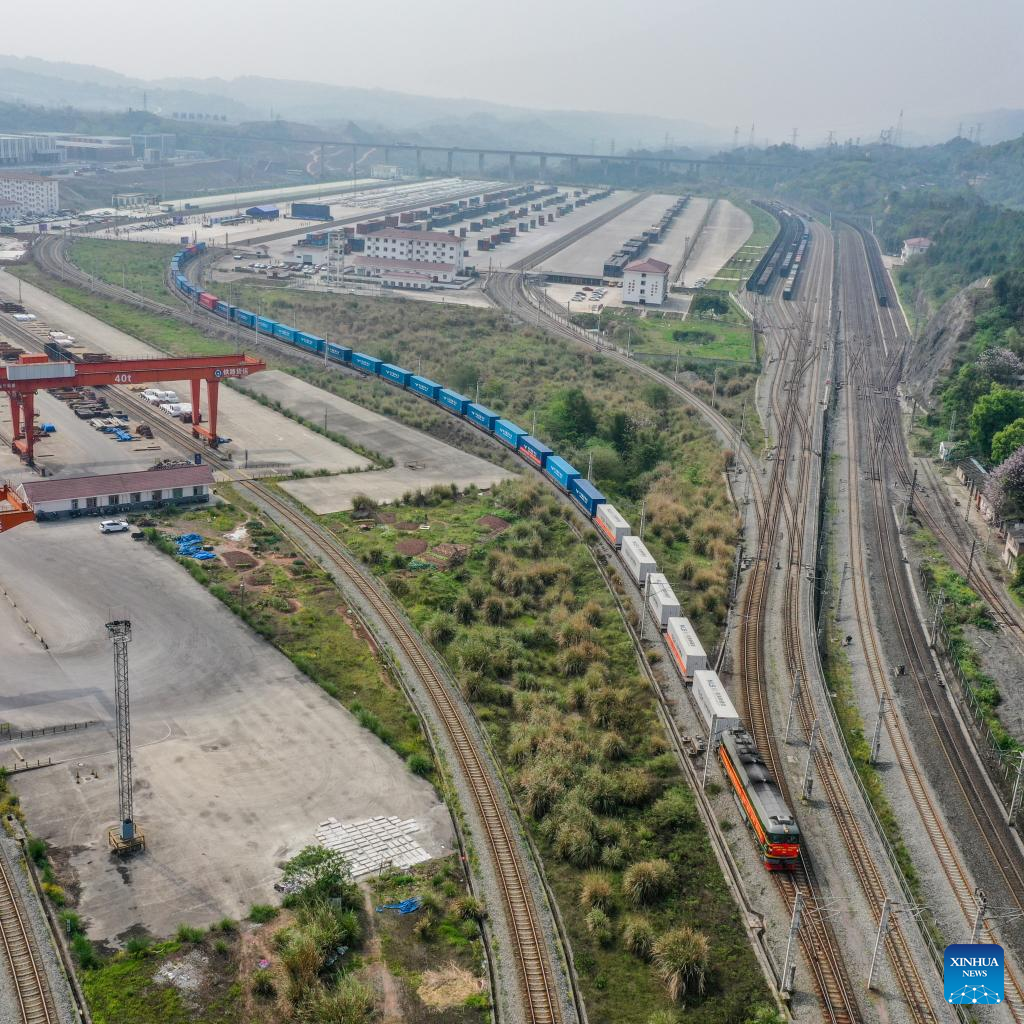 This aerial photo taken on April 3, 2023 shows a freight train departing from the Jiangjin District of southwest China's Chongqing Municipality, marking the opening of a new transport route via the New International Land-Sea Trade Corridor. A total of 32 containers bearing goods such as ammonium sulfate, motorcycle parts and motorcycle tires will be transported to the Baoshan North Station in Yunnan Province. These goods will then be transported via highways, leaving China via a land port in the city of Ruili, before arriving at Myanmar. (Xinhua/Tang Yi)