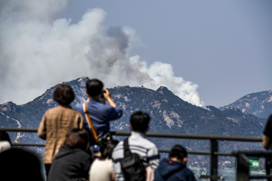 People look out for a forest fire on Mount Inwang in Seoul, South Korea, April 2, 2023. (NEWSIS via Xinhua)