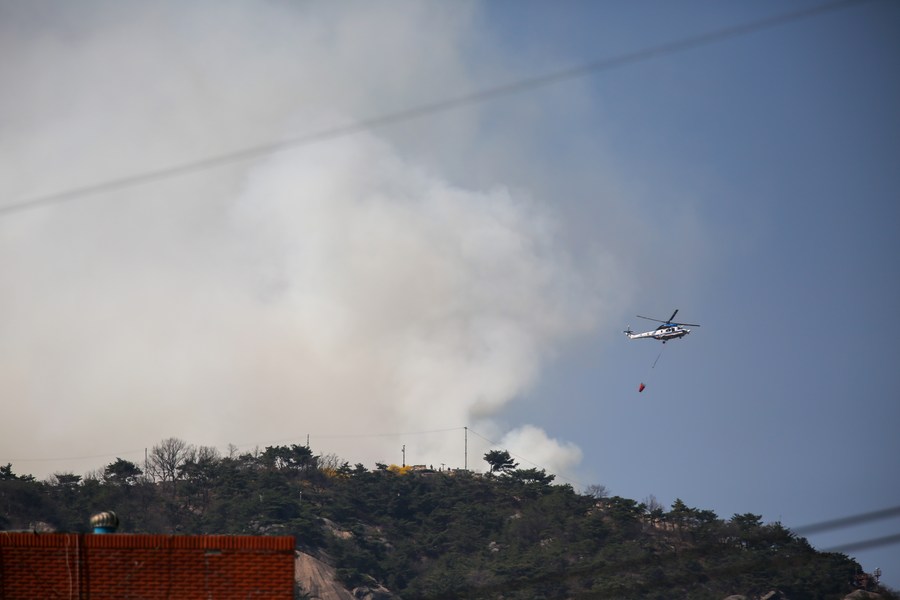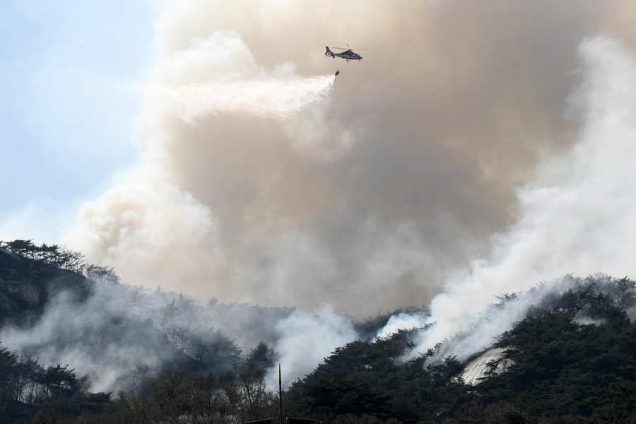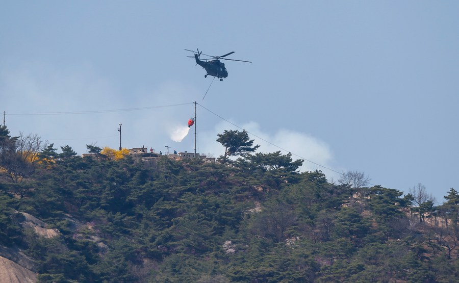 A helicopter tries to extinguish a forest fire on Mount Inwang in Seoul, South Korea, April 2, 2023. (NEWSIS via Xinhua)