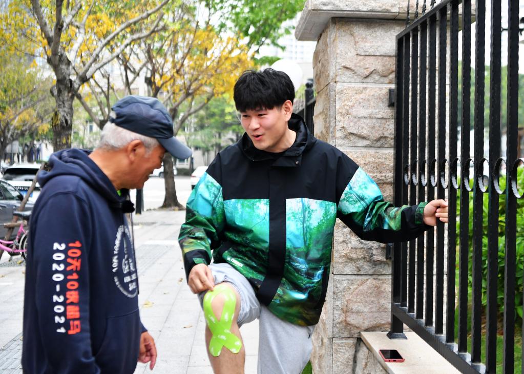 He Shuai (R) exercises with a runner prior to the 2023 Xiamen Marathon, April 1, 2023. (Xinhua/Wei Peiquan)