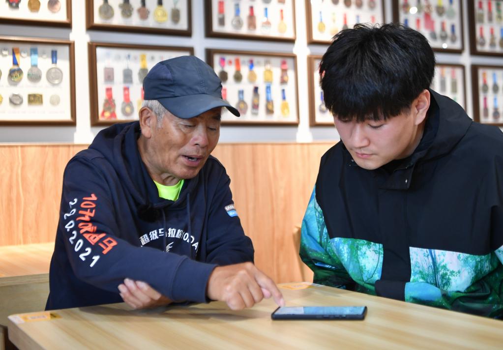 He Shuai displays his father's virtual Marathon account after completing the 2023 Xiamen Marathon, April 2, 2023. (Xinhua/Cao Yibo)