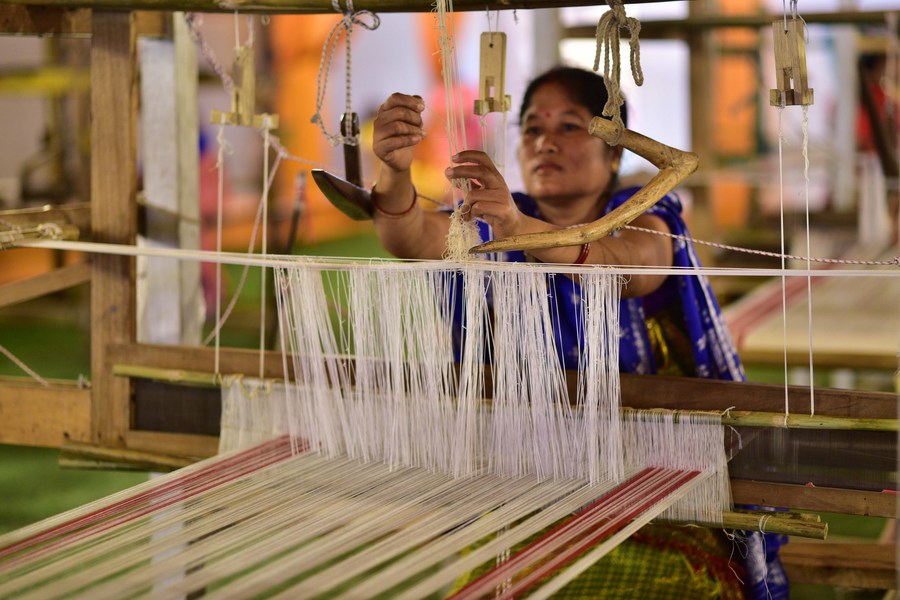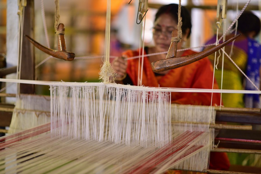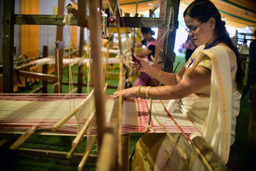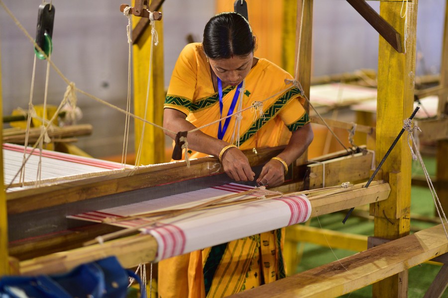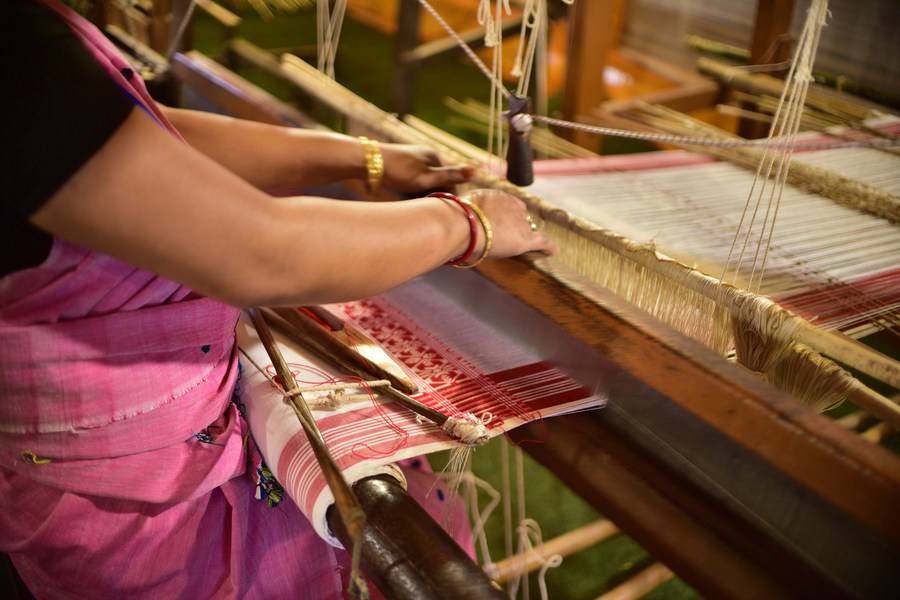 Women weave a traditional body wipe or towel, locally known as gamosa, in Guwahati city of India's northeastern state of Assam, April 2, 2023. (Str/Xinhua)