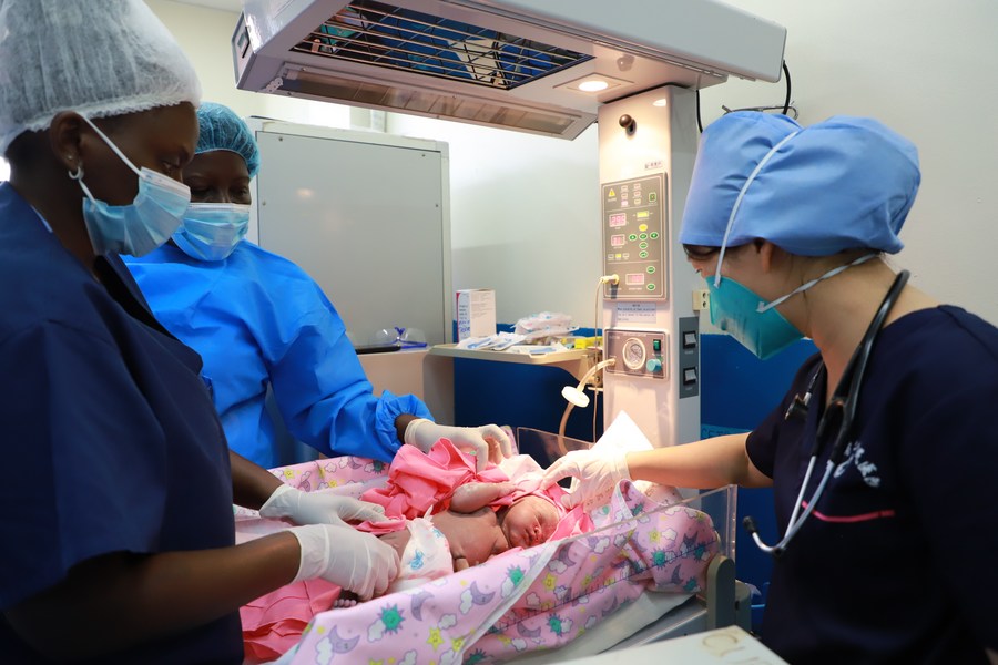 Liu Yun (R) and local medical staff check the health of a newborn at China-Uganda Friendship Hospital in Kampala, Uganda, Aug. 19, 2022. (Xinhua/Zhang Gaiping)