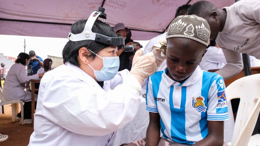 Deng Fang (L), a Chinese specialist in ear, nose and throat (ENT), checks a boy's ear at a medical camp at the Katosi landing site in the Central Region district of Mukono, Uganda, on Feb. 16, 2023. (Photo by Hajarah Nalwadda/Xinhua)