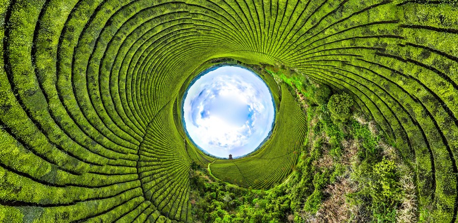 This stitched aerial photo shows tea plantations in Yongxing Town, Meitan County, southwest China's Guizhou Province, April 4, 2023. (Xinhua/Ou Dongqu)