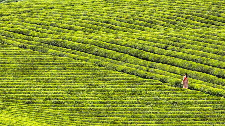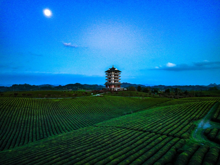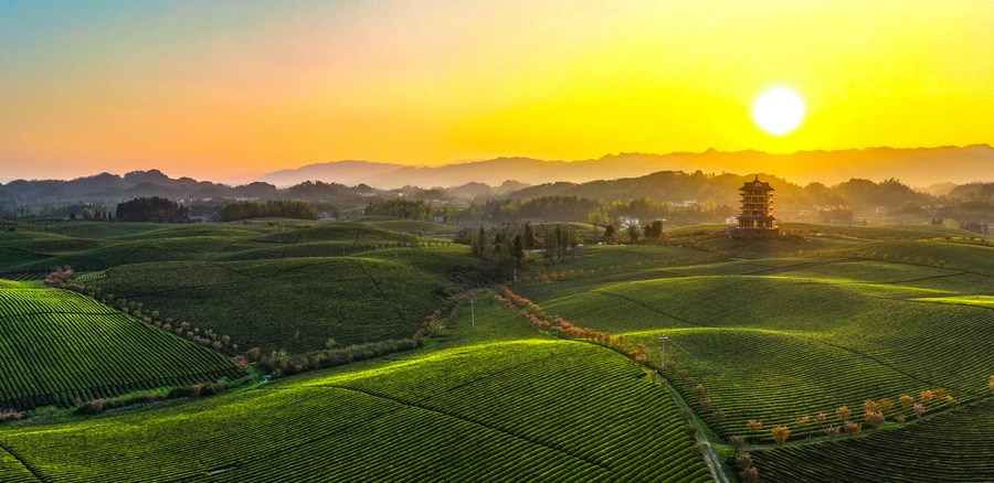 This aerial photo shows tea plantations in Yongxing Town, Meitan County, southwest China's Guizhou Province, April 4, 2023.(Xinhua/Ou Dongqu)