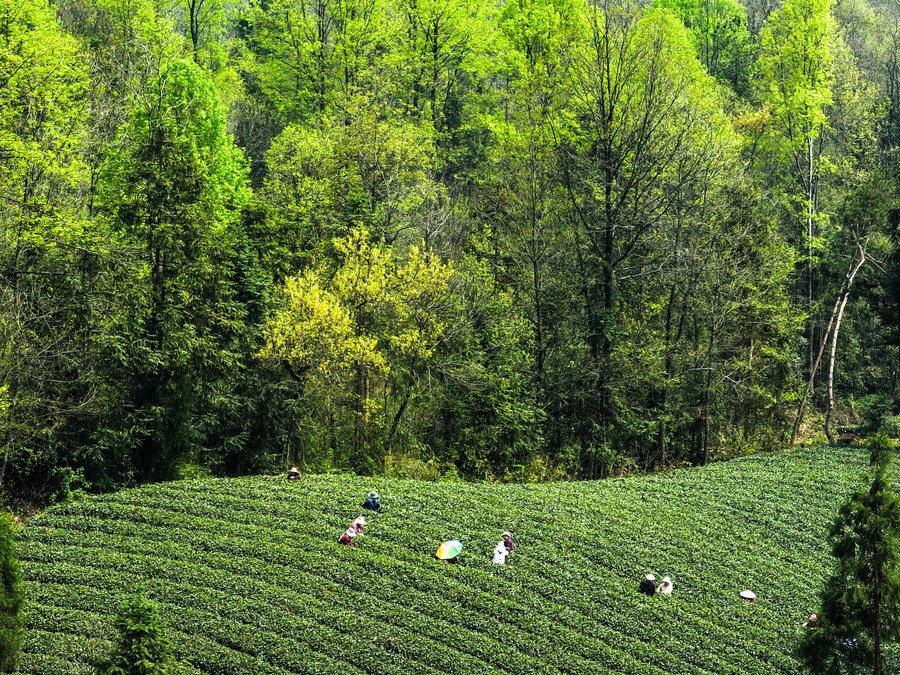 Farmers pick tea leaves at a tea plantation in Meitan County, southwest China's Guizhou Province, April 4, 2023.(Xinhua/Ou Dongqu)