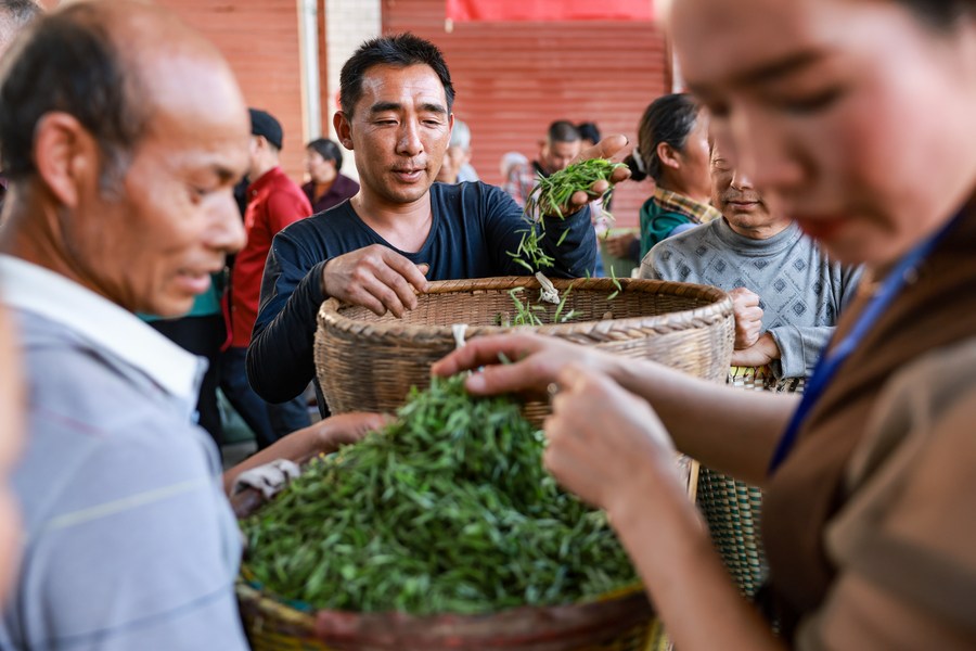 Farmers trade tea leaves at a tea market in Meitan County, southwest China's Guizhou Province, April 4, 2023.(Xinhua/Ou Dongqu)