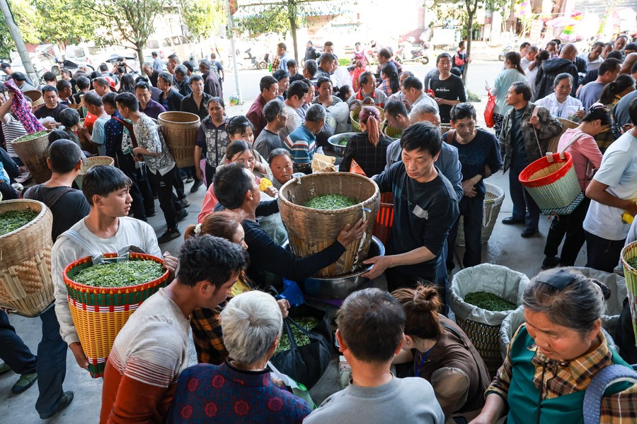 Farmers trade tea leaves at a tea market in Meitan County, southwest China's Guizhou Province, April 4, 2023. (Xinhua/Ou Dongqu)