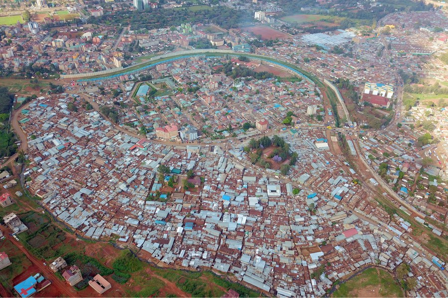 Aerial photo taken on Oct. 16, 2019 shows the Kibera slum, an informal settlement in Nairobi, capital of Kenya, Oct. 16, 2019. (Xinhua/Wang Teng)