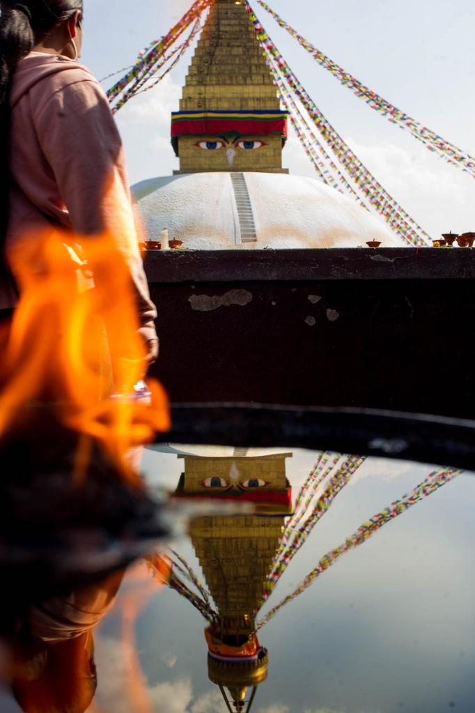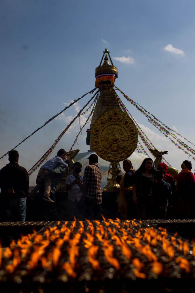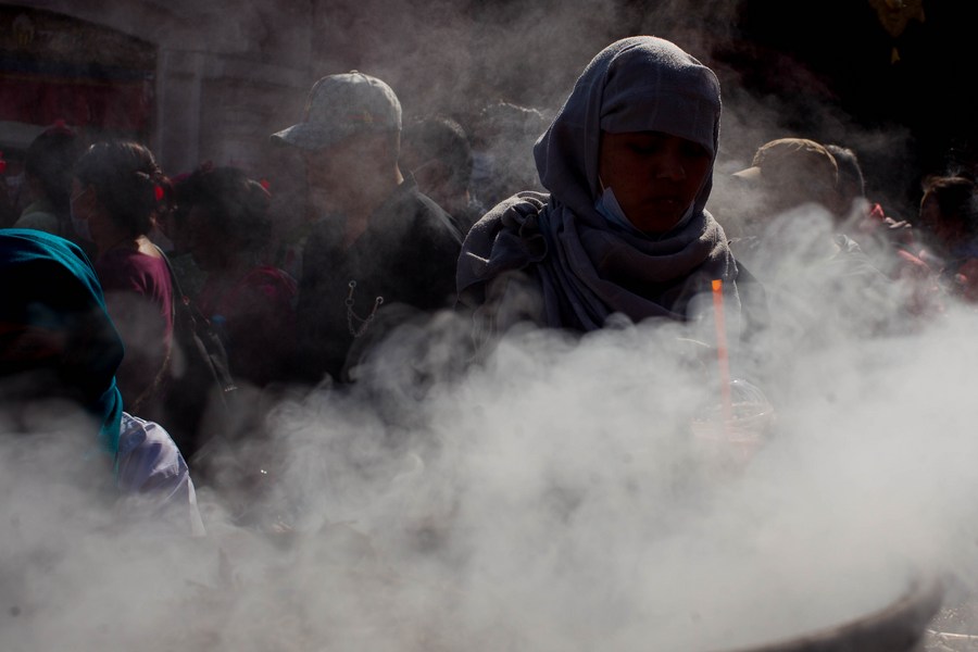 Smoke of burning incense billowed up in the air as thousands, who lined up the stupa's massive mandala, rotated prayer wheels and offered prayers, paying hommage to their loved ones who passed away.