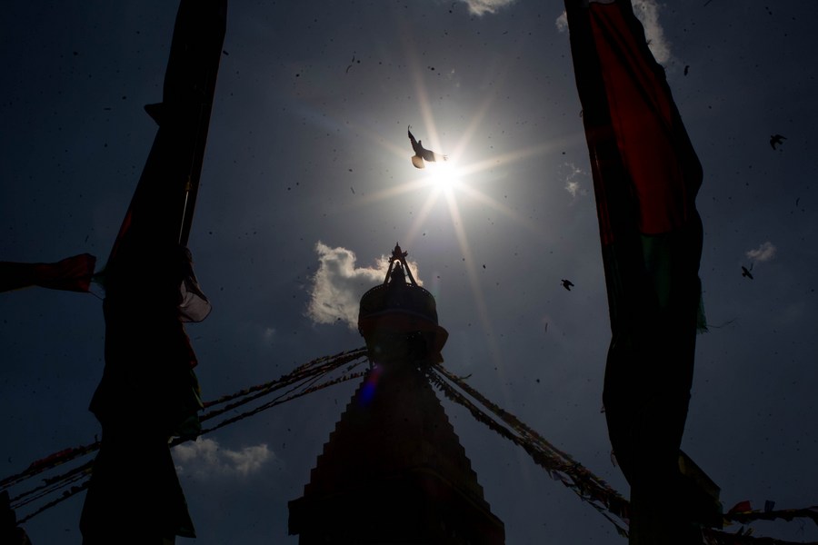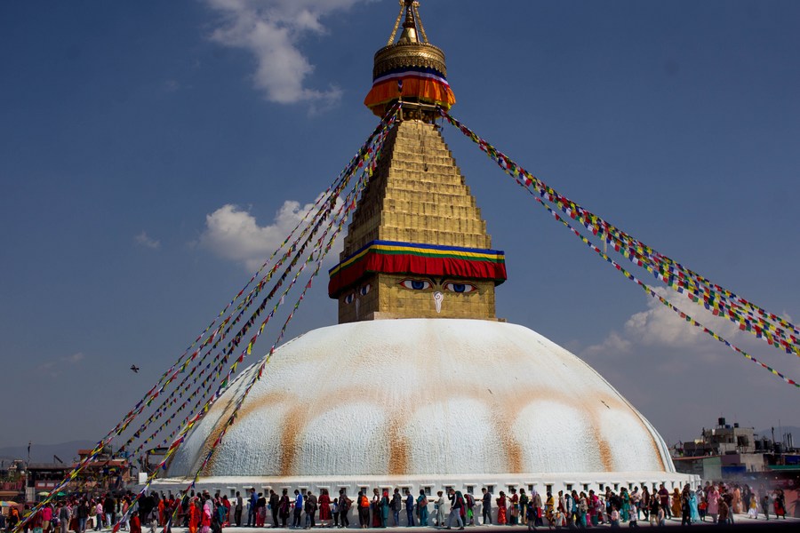 People from the Tamang community celebrate Temal Jatra at Boudhanath Stupa in Kathmandu, Nepal, on April 5, 2023. (Photo by Sulav Shrestha/Xinhua)