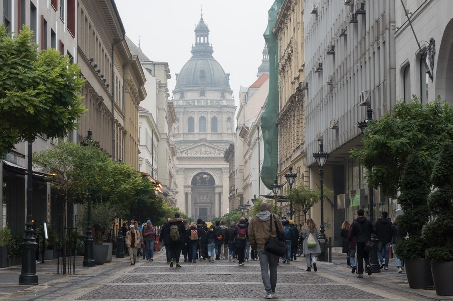 Tourists are seen with St. Stephen's Basilica in the background in Budapest, Hungary, on Nov. 4, 2022. (Photo by Attila Volgyi/Xinhua)