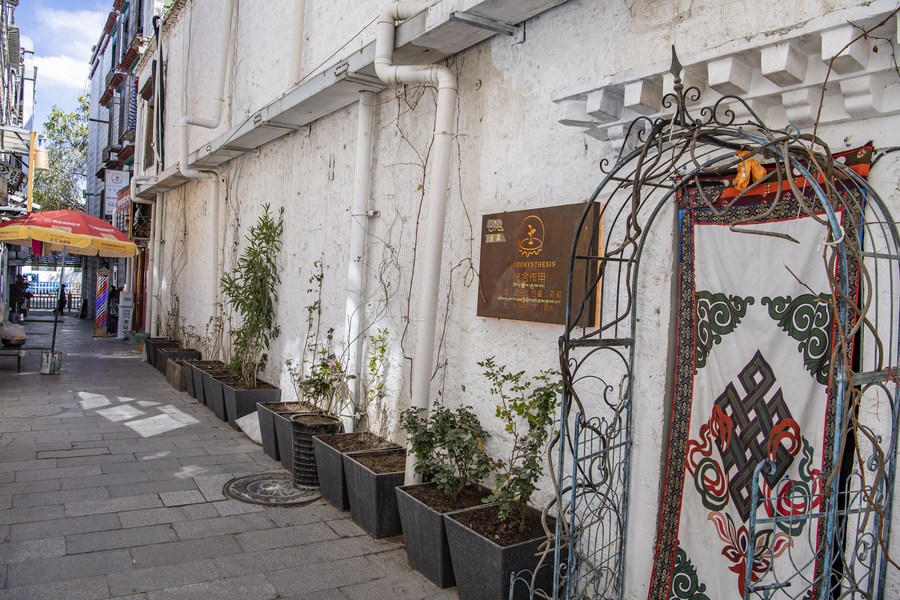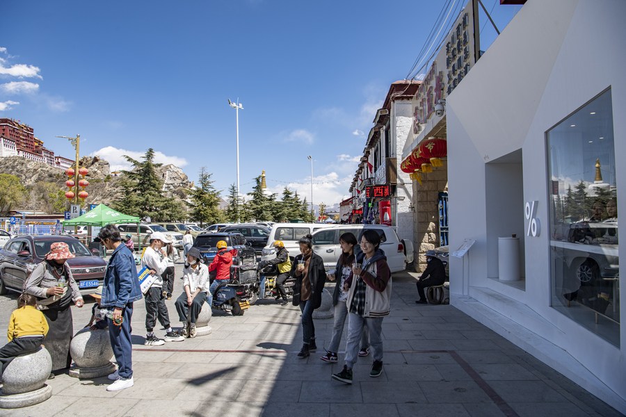 LHASA, April 7 (Xinhua) -- As I drove past the majestic Potala Palace, I glanced to my left and was surprised to see a familiar logo of "%" emblazoned against the backdrop of pristine white. Wait! Could it possibly be the unmistakable signage of a popular cafe brand?