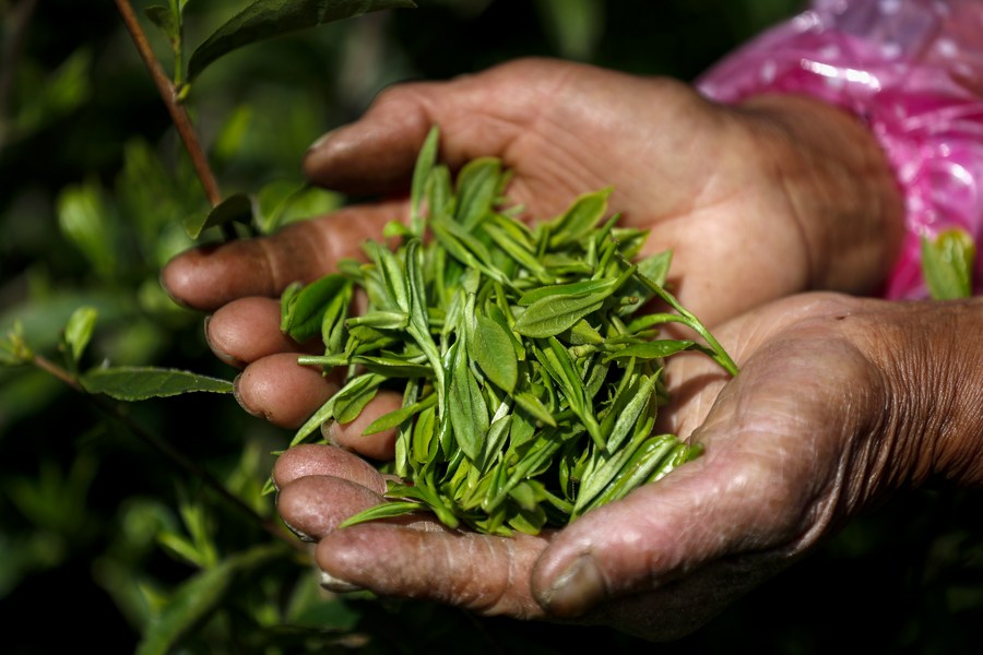 A farmer shows newly-picked tea leaves at a tea garden in Qimen County, east China's Anhui Province, March 28, 2022. (Photo by Shi Yalei/Xinhua)