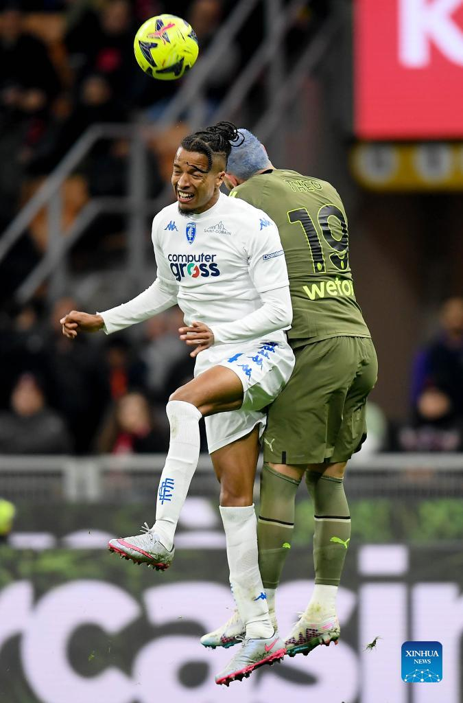 AC Milan's Theo Hernandez (R) vies with Empoli's Jacopo Fazzini during a Serie A football match between AC Milan and Empoli in Milan, Italy, on April 7, 2023. (Photo by Daniele Mascolo/Xinhua)