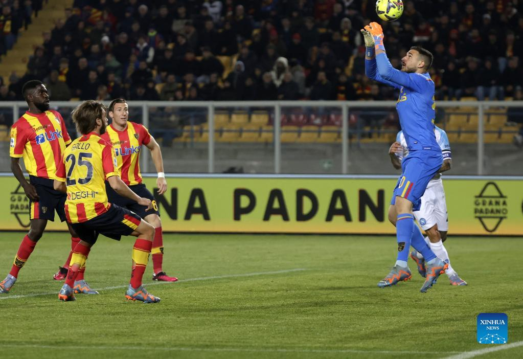 Lecce's Federico Di Francesco scores his goal during a Serie A football match between Napoli and Lecce in Lecce, Italy, on April 7, 2023. (Str/Xinhua)